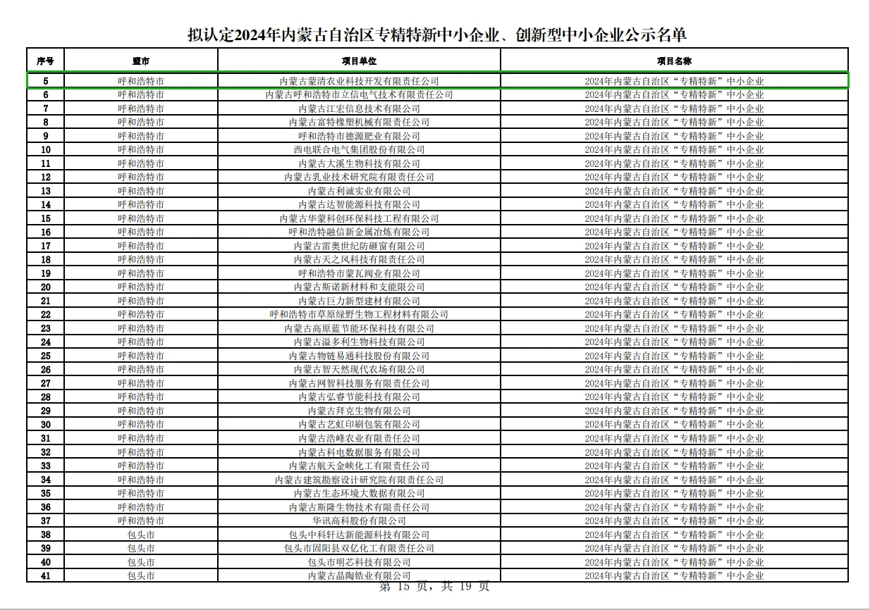 據(jù)6月12日內(nèi)蒙古自治區(qū)工業(yè)和信息化廳公告,內(nèi)蒙古蒙清農(nóng)業(yè)成功榮獲2024年內(nèi)蒙古自治區(qū)專(zhuān)精特新企業(yè)認(rèn)定,這一資質(zhì)的認(rèn)定彰顯了蒙清農(nóng)業(yè)在農(nóng)業(yè)科技領(lǐng)域的杰出成就,同時(shí)也是蒙清科研創(chuàng)新領(lǐng)域多年積累的結(jié)果。